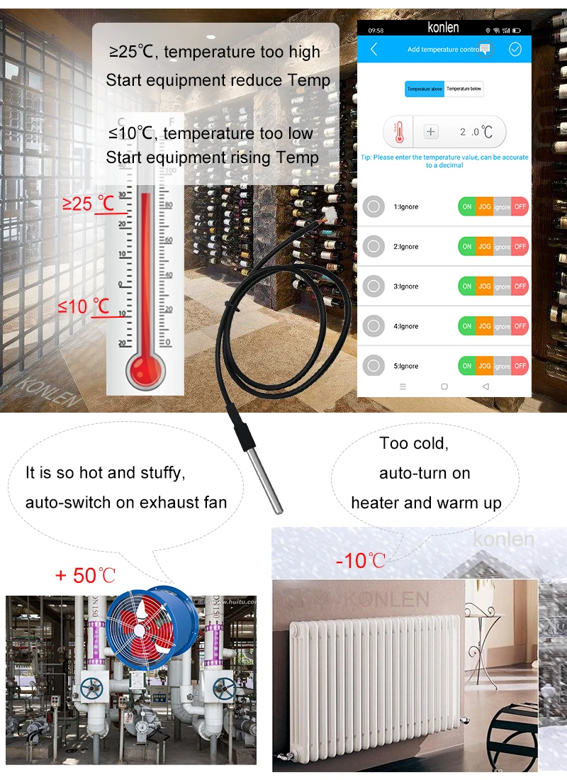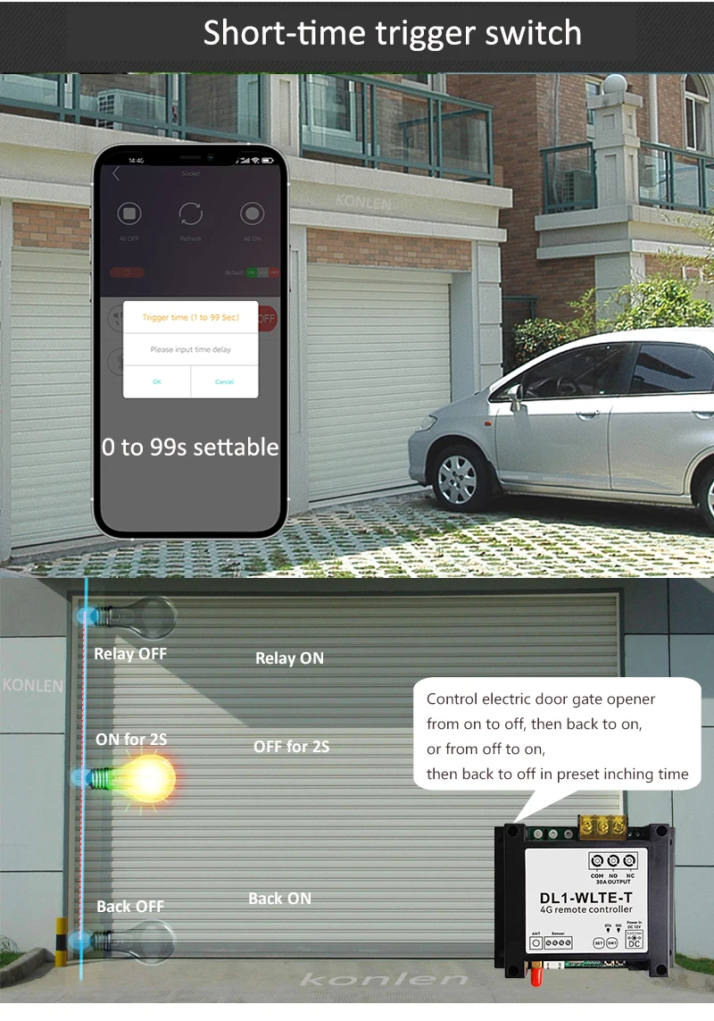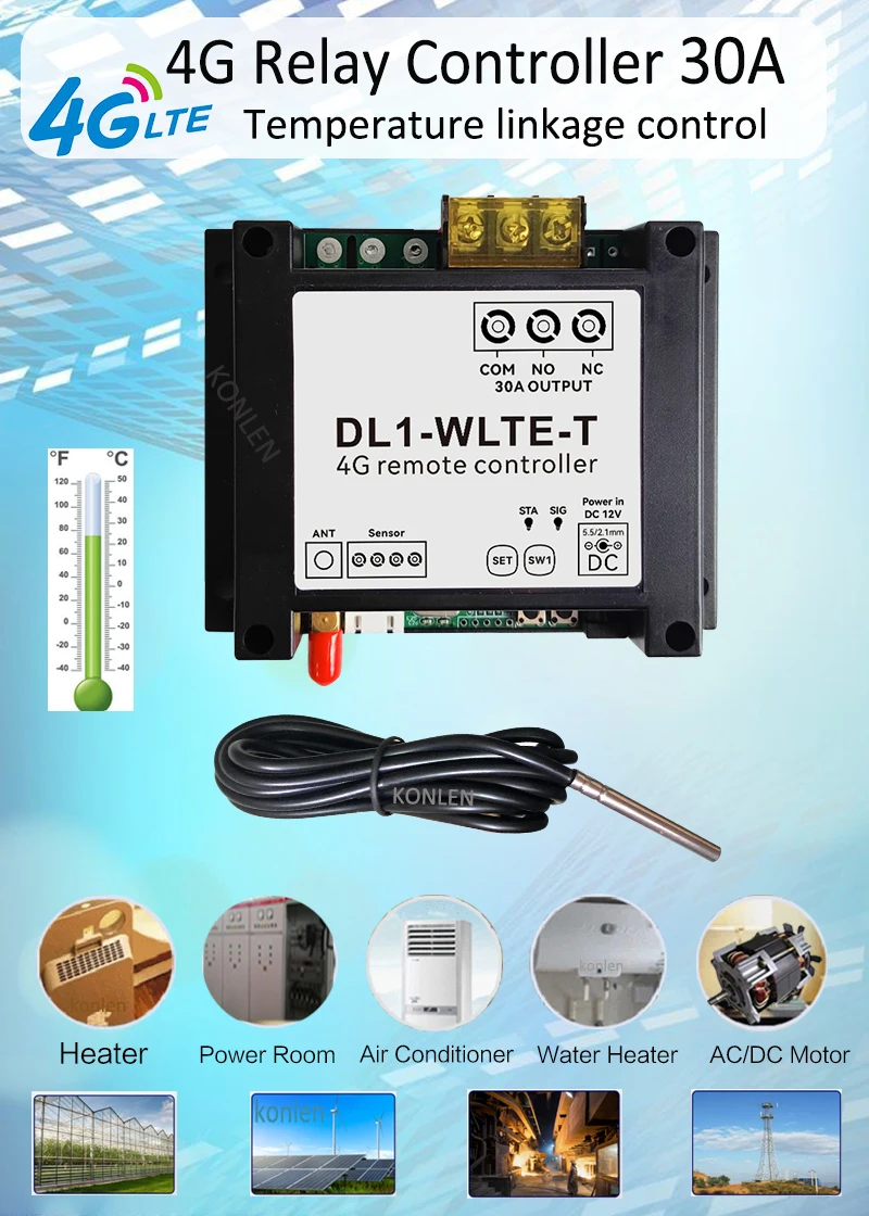 6. Application: it is widely applied to control all types of home appliance, door gate openers, AC Motor, Remote Base Station, Water Pump, Server, breeding, greenhouse etc. konlen