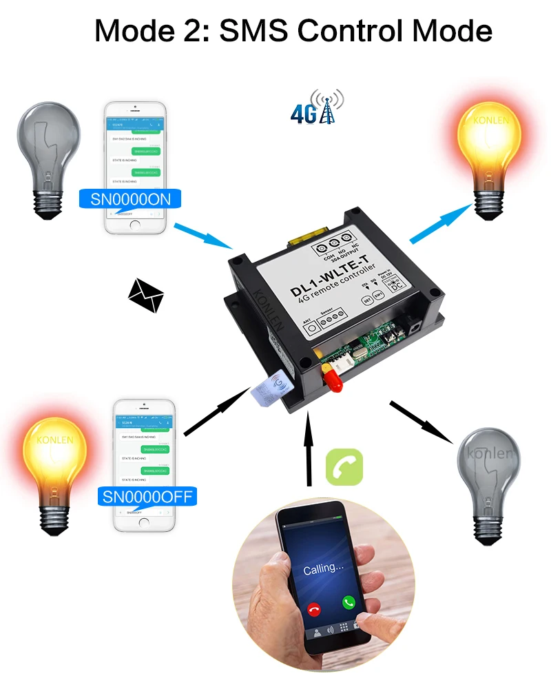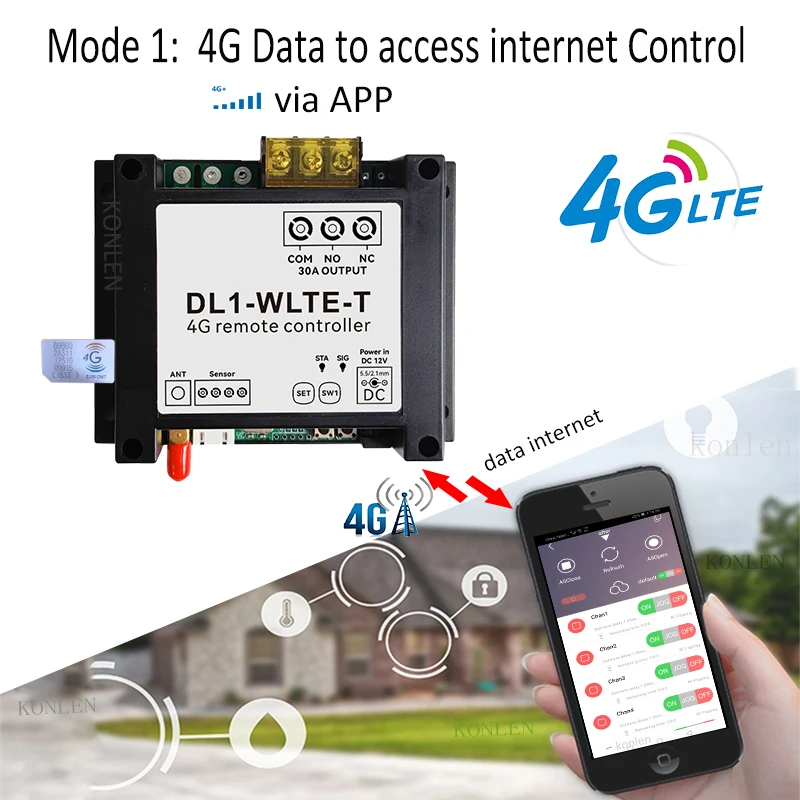 The controller works with 4G LTE network. There are two control modes: 1. 4G data internet control 2. SMS control. In 4G data mode, users can use App(WLTE Control)to control the KONLEN DL1 controller via 4G data internet. For some countries, users need set APN first before usage for activating the 4G data network. In SMS mode, users can control the device by SMS or call.