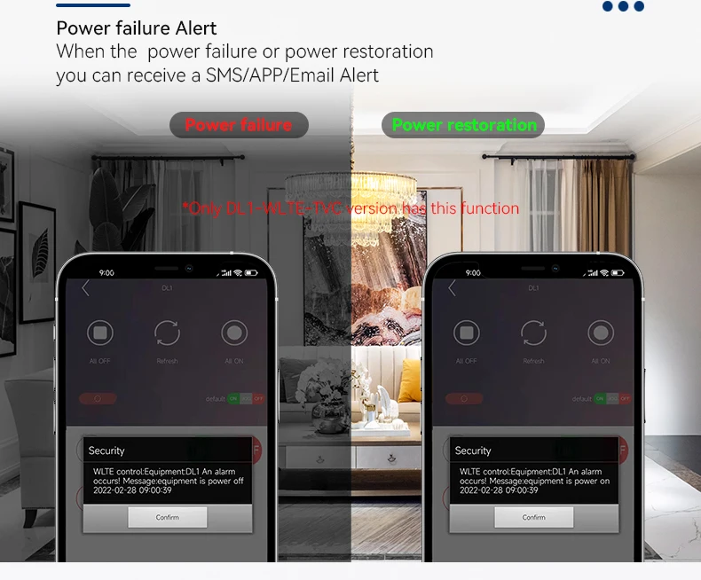 TVC version: model DL1-WLTE-TVC supports power failure alarm function.
