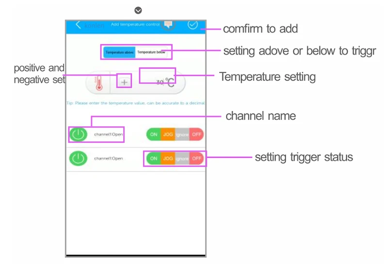 3. With temperature sensor linkage, it can monitor real time temperature, trigger relay switch on/off when temperature upper or lower than the setting limit and push temperature alarm message.
