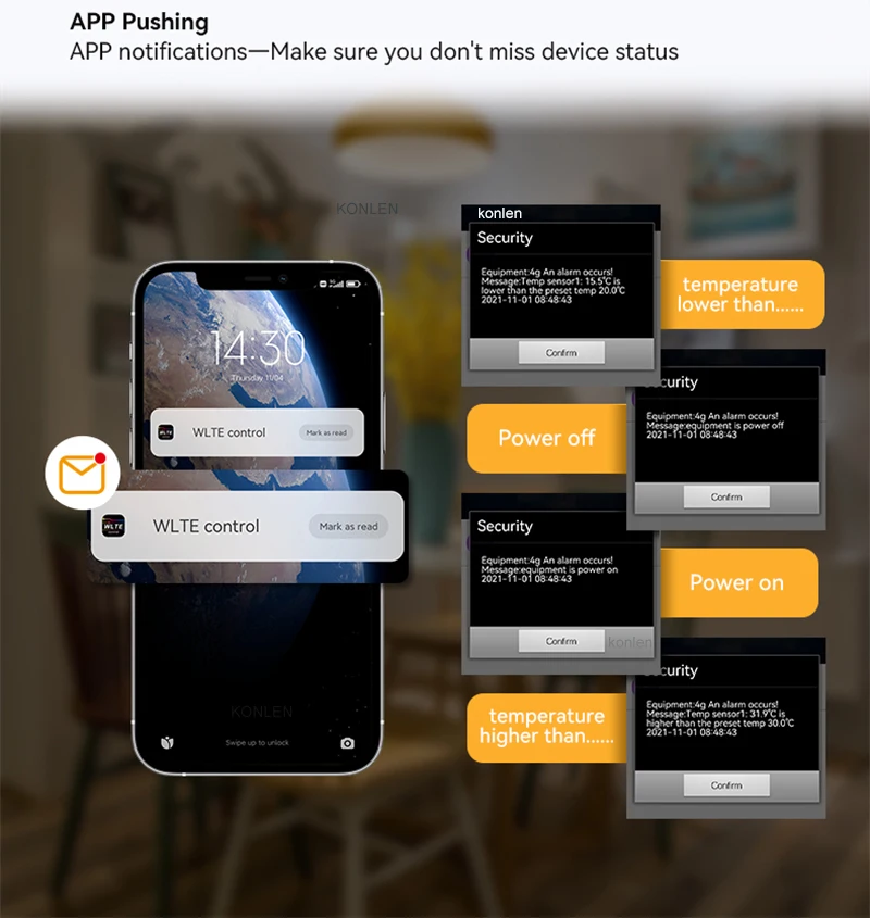 App pushing notification when temperature is upper or lower than the preset limit.