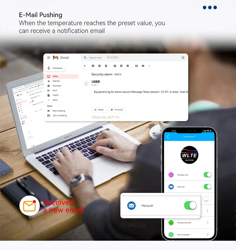 E-mail pushing: Push notification to e-mail when temperature is upper or lower than the preset limit.
